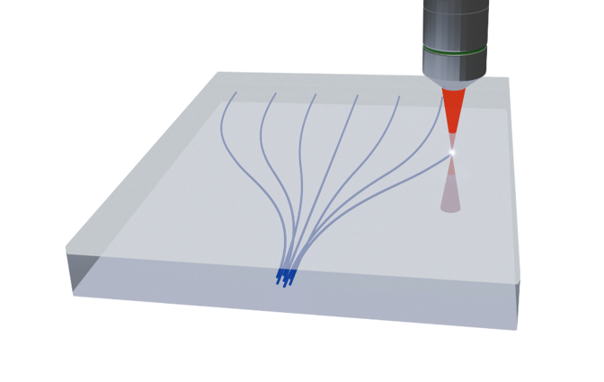 激光直寫(xiě)3D波導(dǎo)技術(shù)利用自開(kāi)發(fā)的飛秒激光直寫(xiě)設(shè)備,通過(guò)精確控制激光在玻璃基材上的寫(xiě)入,實(shí)現(xiàn)高精度的三維波導(dǎo)結(jié)構(gòu)。該技術(shù)具有低損耗、高密度、精細(xì)加工的優(yōu)勢(shì),能夠在微米級(jí)別上精確調(diào)控光的傳播路徑,廣泛應(yīng)用于光學(xué)通信、傳感器和光電集成等領(lǐng)域,推動(dòng)光通信器件和模塊的創(chuàng)新與發(fā)展。