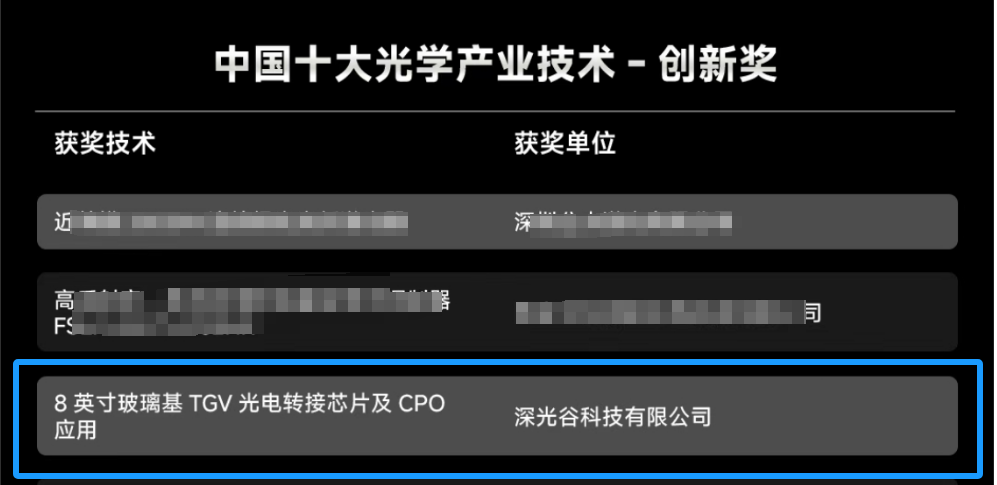深光谷科技推出的“8英寸玻璃基TGV光電轉(zhuǎn)接芯片及CPO應(yīng)用”榮獲2024年度中國(guó)十大光學(xué)產(chǎn)業(yè)技術(shù)創(chuàng)新獎(jiǎng)!